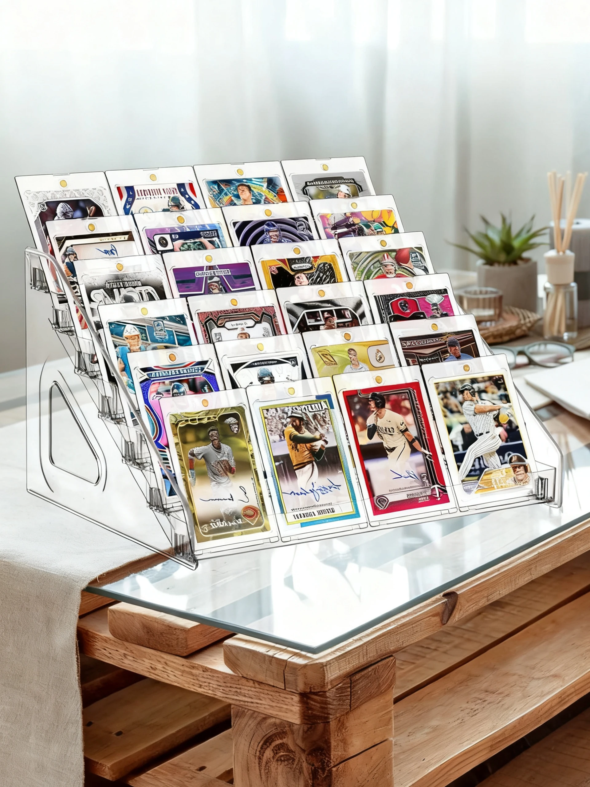 1Whether you're a sports card enthusiast, a card collector, or simply possess other valuable cards, this sports card display stand is designed to cater to various collections. Its modern and minimalist acrylic design enhances the visual appeal of your cards while seamlessly blending into your home decor. Our card holder is ideal for bedrooms, offices, or dedicated collection spaces.